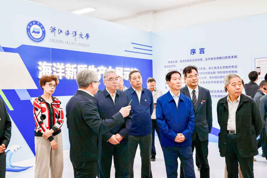 调研组一行抵达浙江海洋大学后,前往国家海洋设施养殖工程技术研究中心以及海洋新质生产力展示馆进行实地考察。近年来,浙江海洋大学紧扣“向海图强”使命,前瞻布局海洋新质生产力赛道,构建了“科技突破 产业升级 数字赋能”的创新体系。学校以数字化平台整合科研资源,推动有组织科研,实现仪器设备与数据资源高效共享。在深远海养殖领域,学校首创升降式网箱、声波围栏等智能装备,实现养殖从近岸向深远海的战略转移;创新海洋生物多样性修复模式,推动渔业从“量增”向“质升”转变。在海洋科技前沿,学校自主研发的海洋5G通信技术将海上通信距离提升至50-70公里,为智慧海洋建设提供“数字底座”;“不动冷藏”超低温保鲜、商渔船防碰撞预警系统等成果,已在全国1800余艘渔船和200多个项目中应用,加速科技成果向新质生产力转化。此外,学校还积极布局蓝碳经济,开展贻贝养殖碳汇研究,探索海洋生态价值实现新路径。