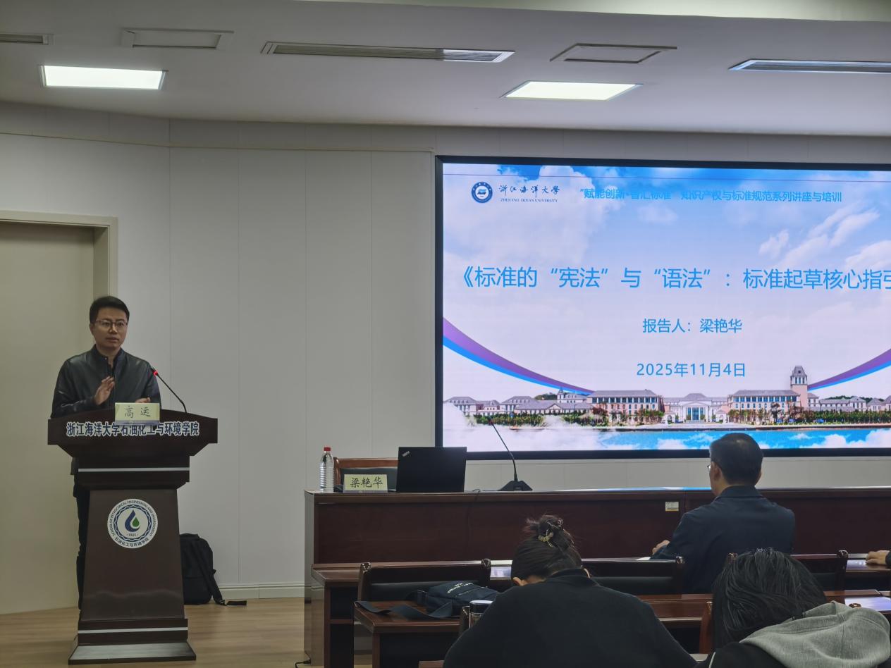 为全面提升师生标准化能力,赋能科技创新与成果转化,11月4日上午,浙江海洋大学举办“赋能创新·智汇标准”知识产权与标准规范系列讲座与培训第二期。本期主题为《标准的“宪法”与“语法”:标准起草核心指引》,特邀浙江省数字经济学会标准化专委会主任委员、国家标准技术审评中心评估专家梁艳华担任主讲。学校科技处副处长高运主持本次活动。