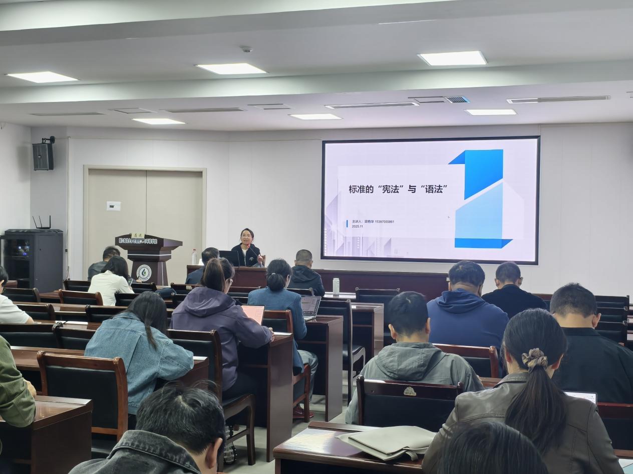 “起草标准如同写作,GB/T 1.1是必须遵循的‘宪法’,而‘语法’则决定了文本是否严谨、清晰。” 梁艳华以生动比喻切入,系统解构了标准起草的基本规则与逻辑框架。她从标准文件的名称、结构、条款层次等“骨架”入手,结合典型案例对比,阐释“可操作性”与“可证实性”核心原则,强调“标准语言应如明镜,准确反映技术共识,而非描绘未来愿景。”整场讲座内容深入浅出,贴近实际,为师生提供了一堂扎实的标准起草指导课。